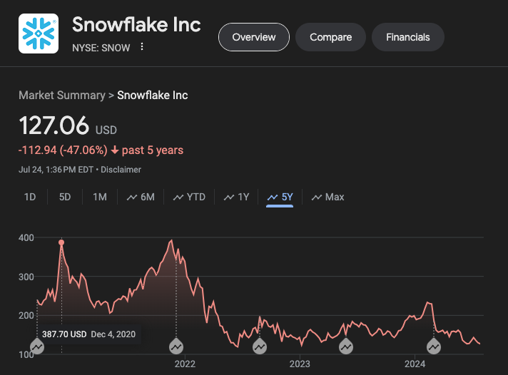 - For reference, in the frothy IPO markets of the 2020/2021 era, a select few companies like Snowflake (stock price trajectory shown below) shot up to something like a 150x revenue multiple. Snowflake currently trades at ~20x